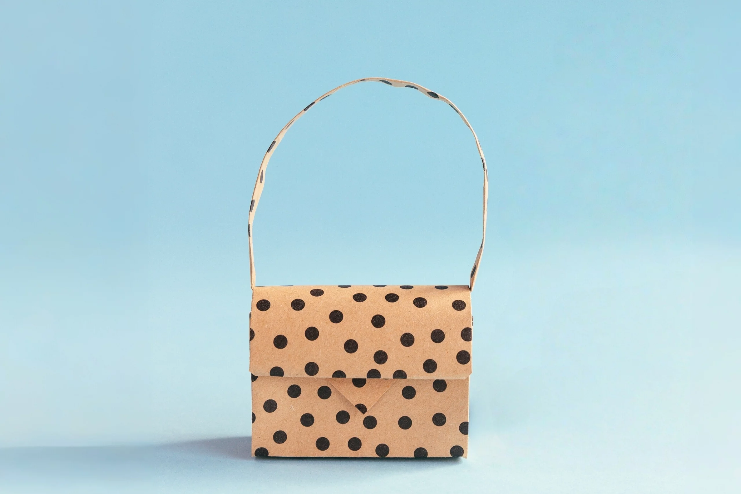 The paper used for the final paper bag can change the style a lot. For example, if you use wrapping paper with polka dots, you will get a vintage suitcase.