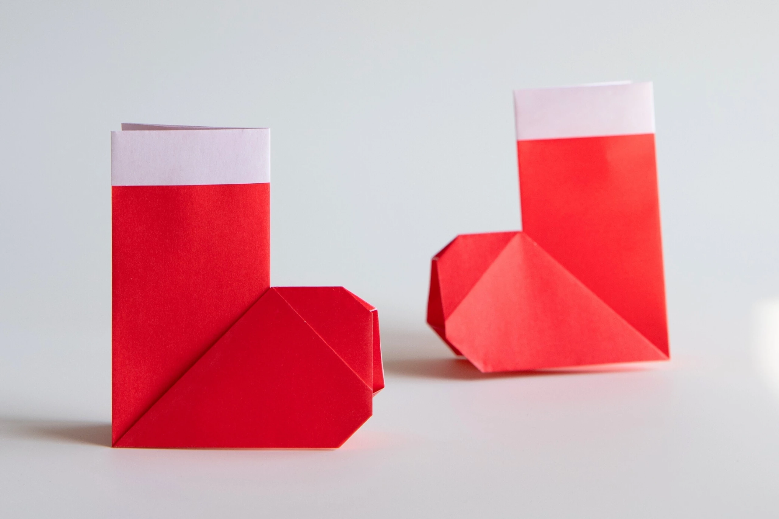Get 15*15 cm origami paper, one red and one white side, and you will get 8.6 cm classic Santa boots. Other sizes of square paper will be available.
